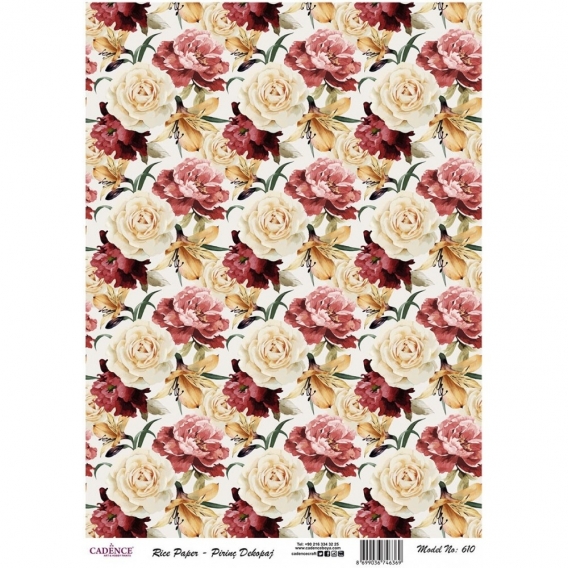 Pirinç kağıt dekopajlar çeltik sapından yapılan ince kâğıt üzerine basılı olup, dekopaj çalışmaları için kullanımı kolay, ince ve dirençli her türlü yüzeyde Cadence Decoupage Plus ile keyifle kullanılabilir. Tasarımlar Cadence için özel hazırlanmıştır.