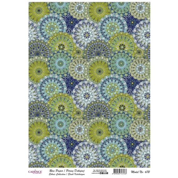 Pirinç kağıt dekopajlar çeltik sapından yapılan ince kâğıt üzerine basılı olup, dekopaj çalışmaları için kullanımı kolay, ince ve dirençli her türlü yüzeyde Cadence Decoupage Plus ile keyifle kullanılabilir. Tasarımlar Cadence için özel hazırlanmıştır.